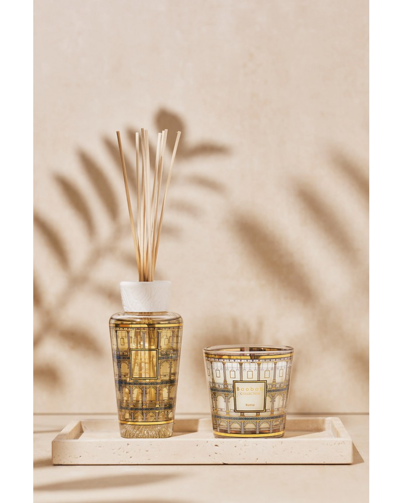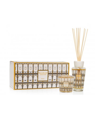 Le coffret cadeau MY FIRST BAOBAB ROMA est recouverte d’une sérigraphie d’or et de couleurs représentant l’architecture mythique du Colisée. Nous l’avons réinterprété avec faste, lui donnant une allure riche et sophistiquée où l’or et les frises colorées rappellent les plafonds des monuments de la Renaissance.
