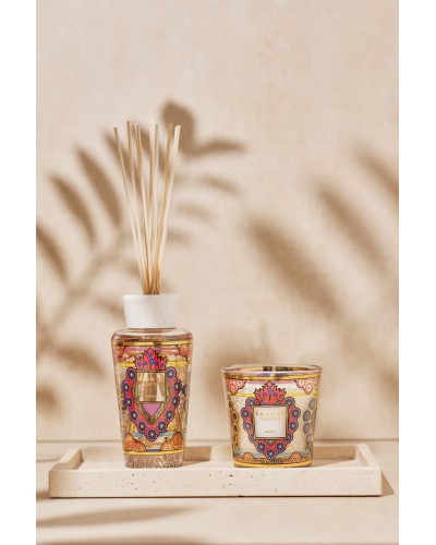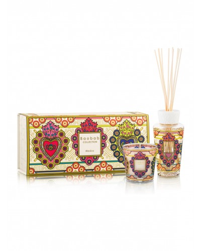 La bougie parfumée et le diffuseur de parfum Mexico sont décorés d’une sérigraphie or et multicolore à l’effigie du célèbre ex-voto mexicain. L’ex voto en forme de cœur servait à adresser un vœu ou à remercier de la grâce qui nous est accordée. On remarque sur le verre en filigrane or, un motif de broderie, signature de l’artisanat mexicain et des corsage de Frida Kahlo.