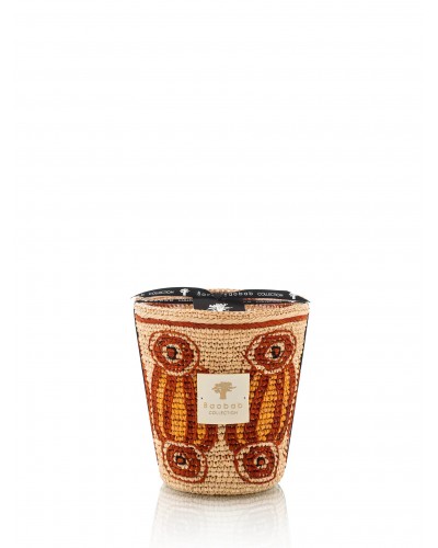 La bougie parfumée Alasora est recouverte d’un raphia beige sur lequel le motif aborigène représentant les sites sacrés est tissé et coloré d’un mélange d’ocre rouge et de noir. Tissée à la main par une coopérative de femmes à Madagascar, cette bougie est, dans ses couleurs, la plus africaine.