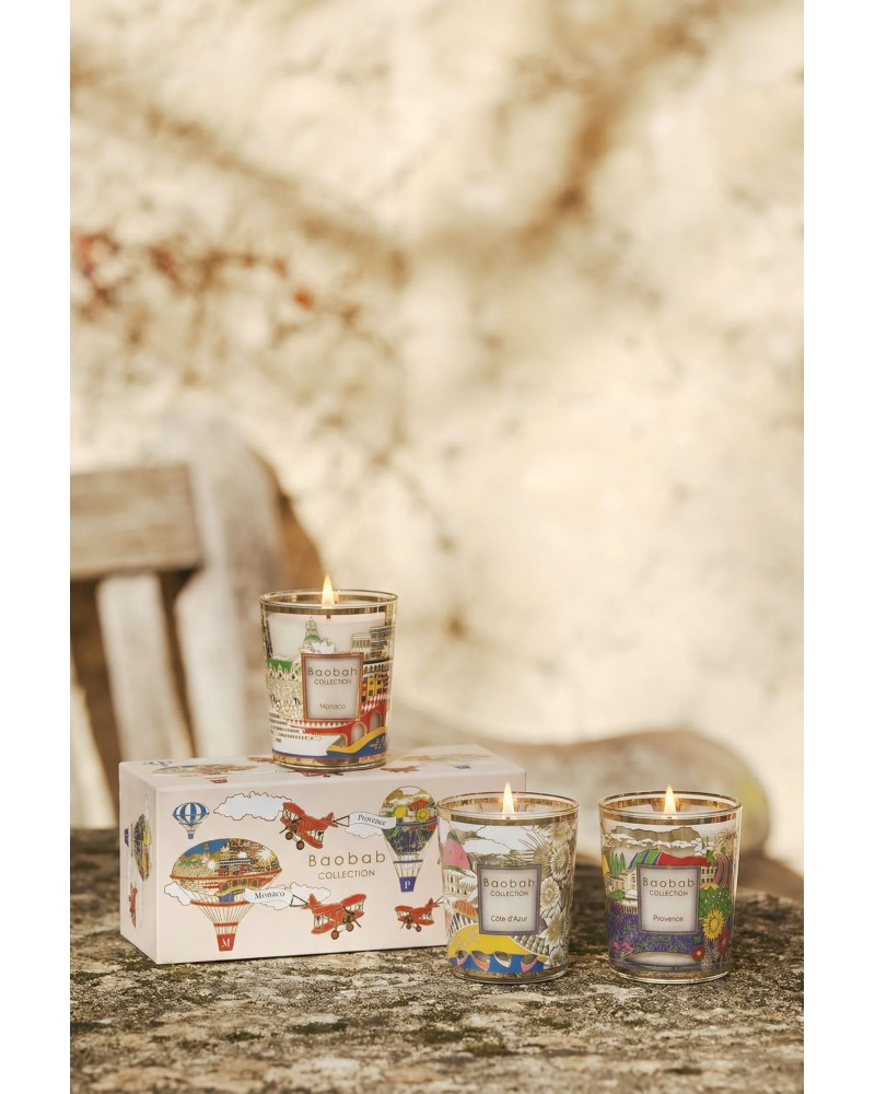 Le coffret cadeau « Cap vers le sud » rassemble trois mini bougies imaginées comme des escales le long de la côte méditerranéenne ou dans la campagne provençale. Présentées dans un coffret décoré de montgolfières colorées, chaque bougie est illustrée en fonction de sa destination, transformant ce trio en un véritable objet de collection à offrir ou à conserver comme souvenir d'été.