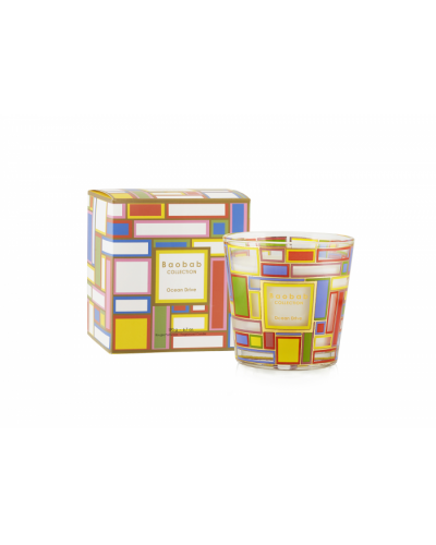 La bougie parfumée Ocean Drive est décorée d’un motif graphique sérigraphié inspiré par l’artiste Peter Halley. Le décor de cette bougie est une interprétation abstraite des couleurs des néons des vitrines d’Ocean Drive.